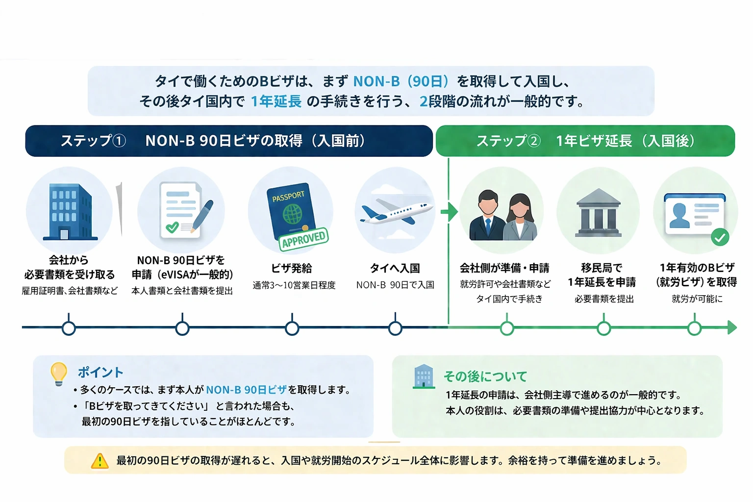 多くのケースでは、まず NON-B(90日) を取得し、その後タイ入国後に 1年延長 の手続きへ進む流れになります。